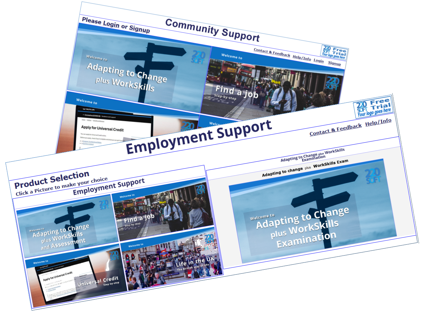 | The "Community Support" and the "Employment Support" collections both give support in job hunting and the government's online Find a job process. To help those wanting to know more about and claim Universal Credit there is a step by step guide for users to follow. For people currently arriving in the United Kingdom to settle in their new home, "Life in the UK (the British way of Life)" is a guide to prepare people for many aspects of British life. | Products Supplied with the Community Support Subscription 1. Adapting to Change plus WorkSkills 2. Find a job – Step by Step 3. Universal Credit – Step by Step 4. Life in the UK – The British way of Life 5. The Community Support Collection